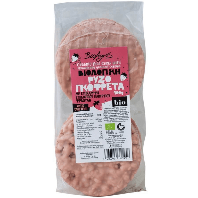 Συστατικά: Ρύζι* 50%, επικάλυψη επιδορπίου γιαουρτιού φράουλας* 50% (βούτυρο κακάο*, ακατέργαστη ζάχαρη από ζαχαροκάλαμο*, γιαούρτι σε σκόνη*, πλήρες γάλα σε σκόνη*, ορός γάλακτος*, φυσικό άρωμα φράουλας, παντζάρι κόκκινο*, γαλακτωματοποιητής: λεκιθίνη ηλίανθου*).